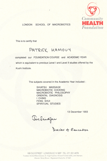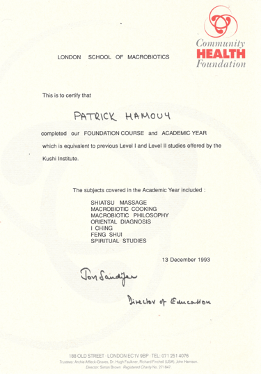 Patrick followed a macrobiotic course from 1991 to 1993 to understand how he triggered his cancer.